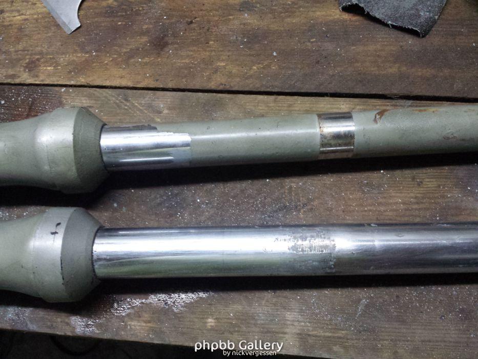 Je vais également m'occuper des fourches et j'ai commencé à ôter cette merde mise sur les tubes :evil: quelle idée de faire un truc pareil. J'ai constaté qu'une partie du tube (à environ 15cm au dessus du cache) était rugueuse (voir photo). Vous en pensez quoi ? c'est pas grave non...