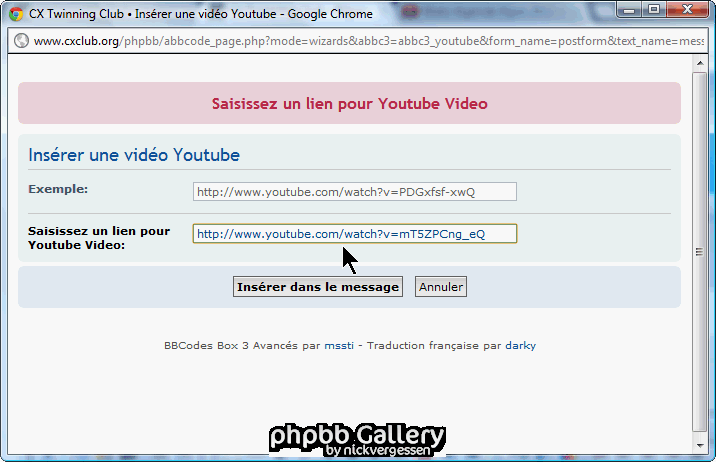 Votre lien sera alors encadré par les balises « [ bbvidéo ] » et sera correctement interprétée.